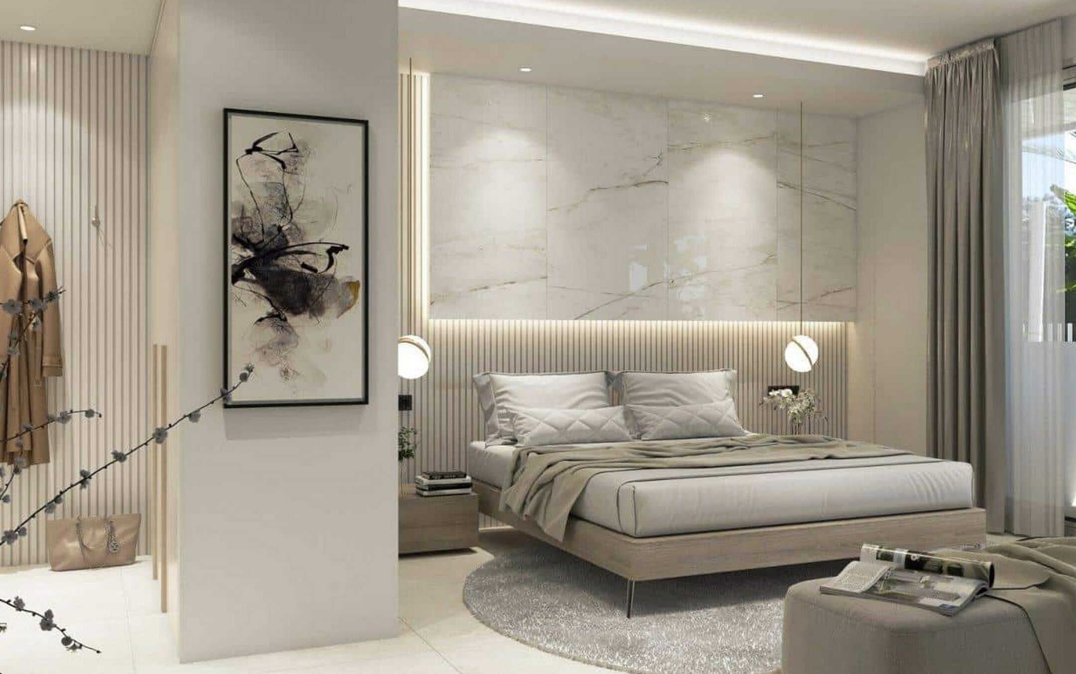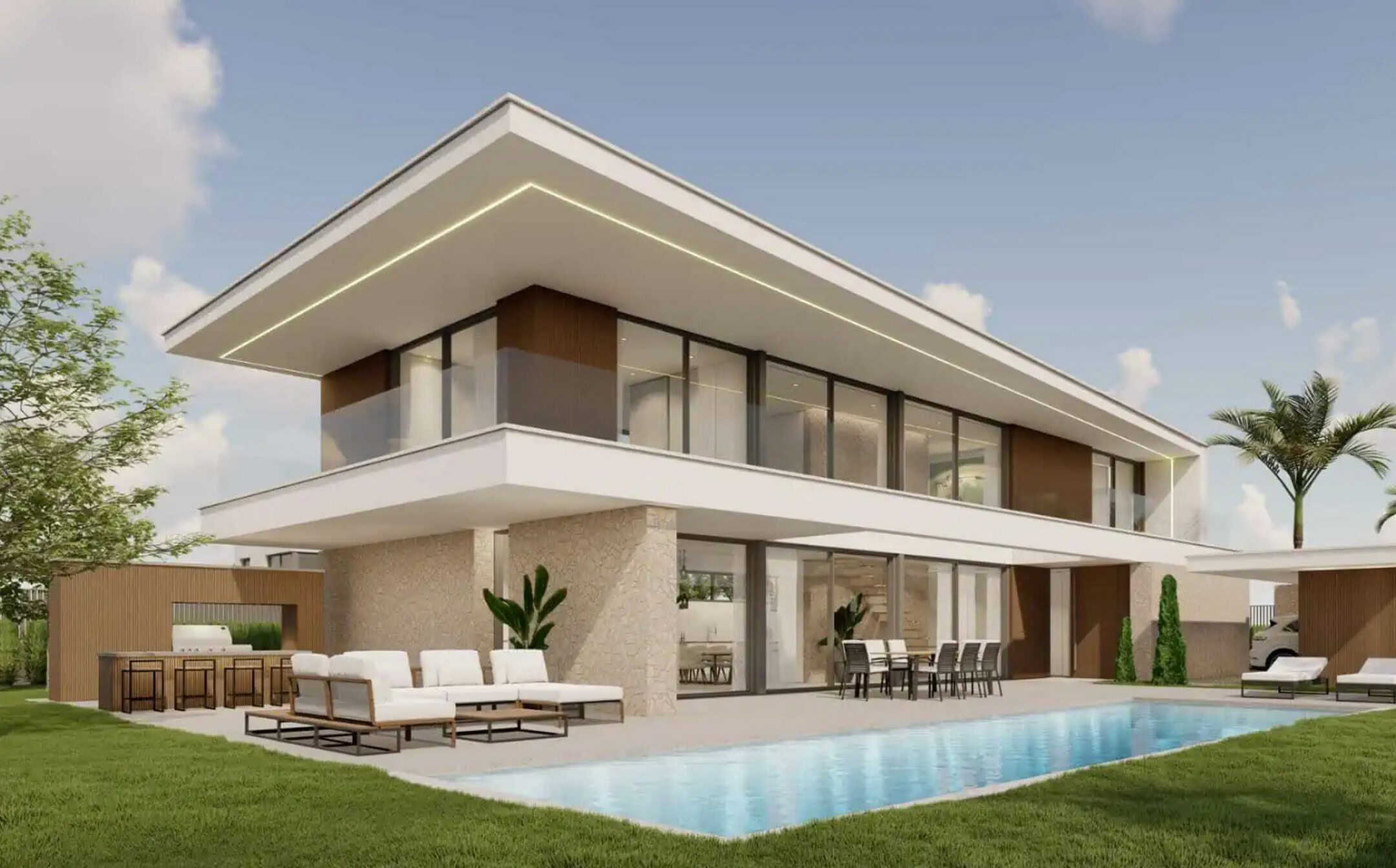 This exquisite two-story villa includes four master bedroom suites, each with spa-style bathrooms, along with an additional family bathroom. The open-plan design is contemporary and features a custom kitchen, a laundry room, and a living and dining area, all finished to the highest standards with exceptional attention to detail.