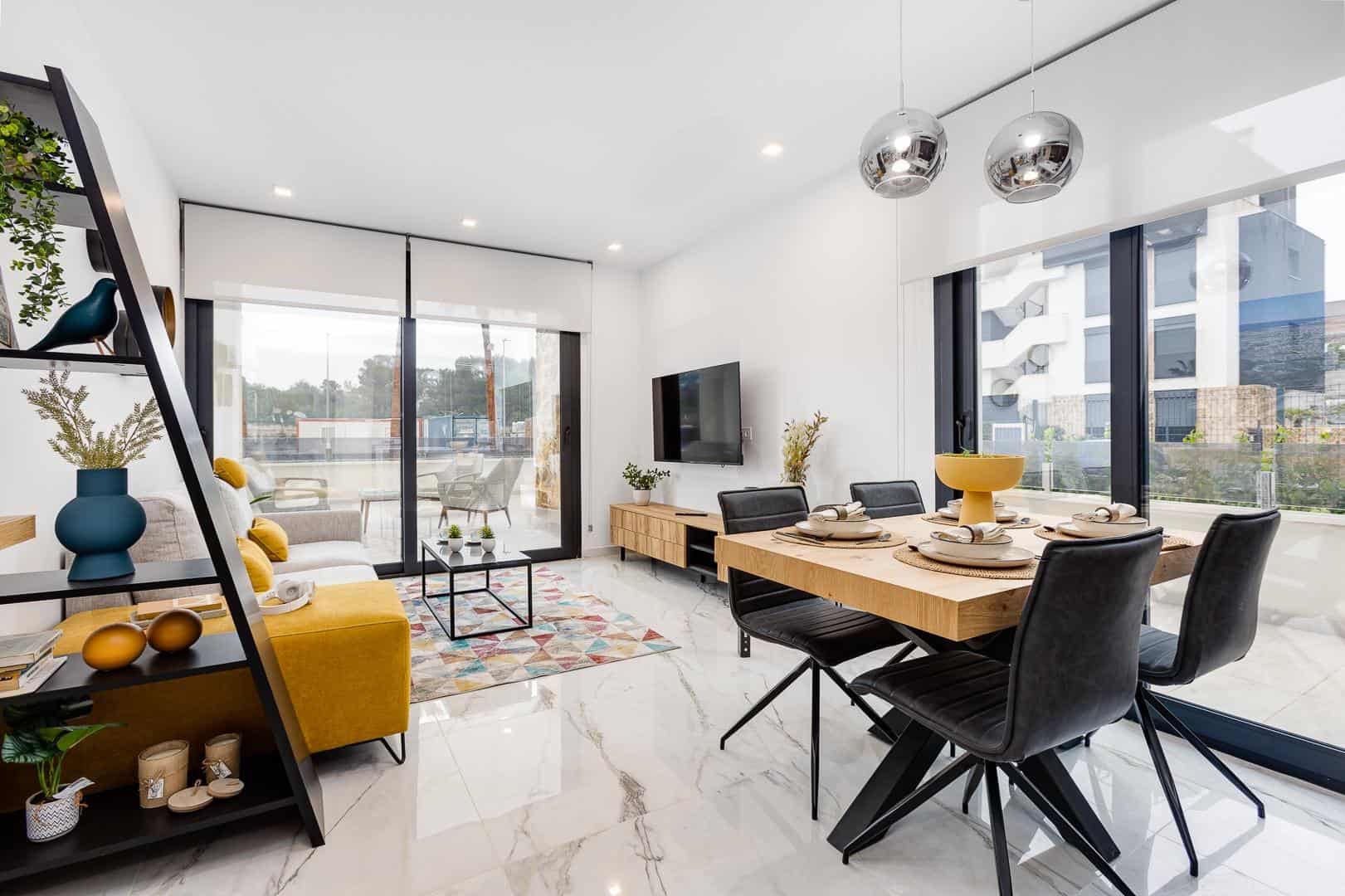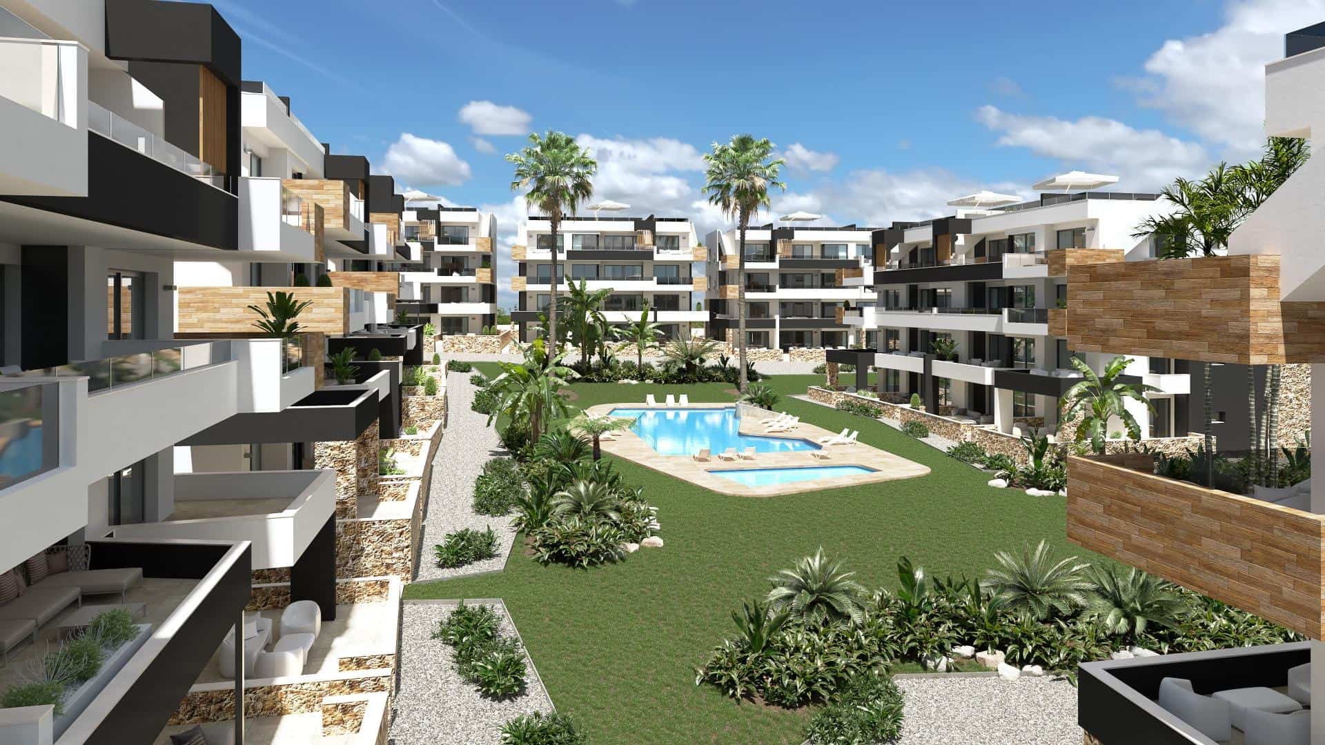 Stunning contemporary fully equipped apartments and penthouses with an open plan kitchen and living room, 2 bedrooms, 2 bathrooms, spacious terraces, and lovely communal areas in Los Altos, Villamartin.