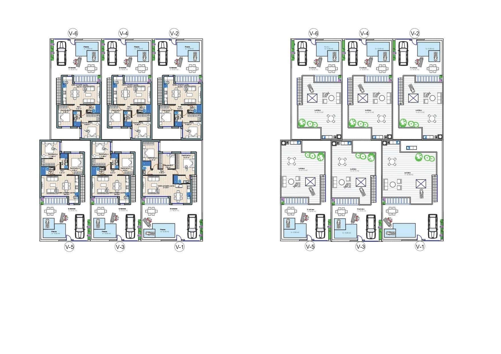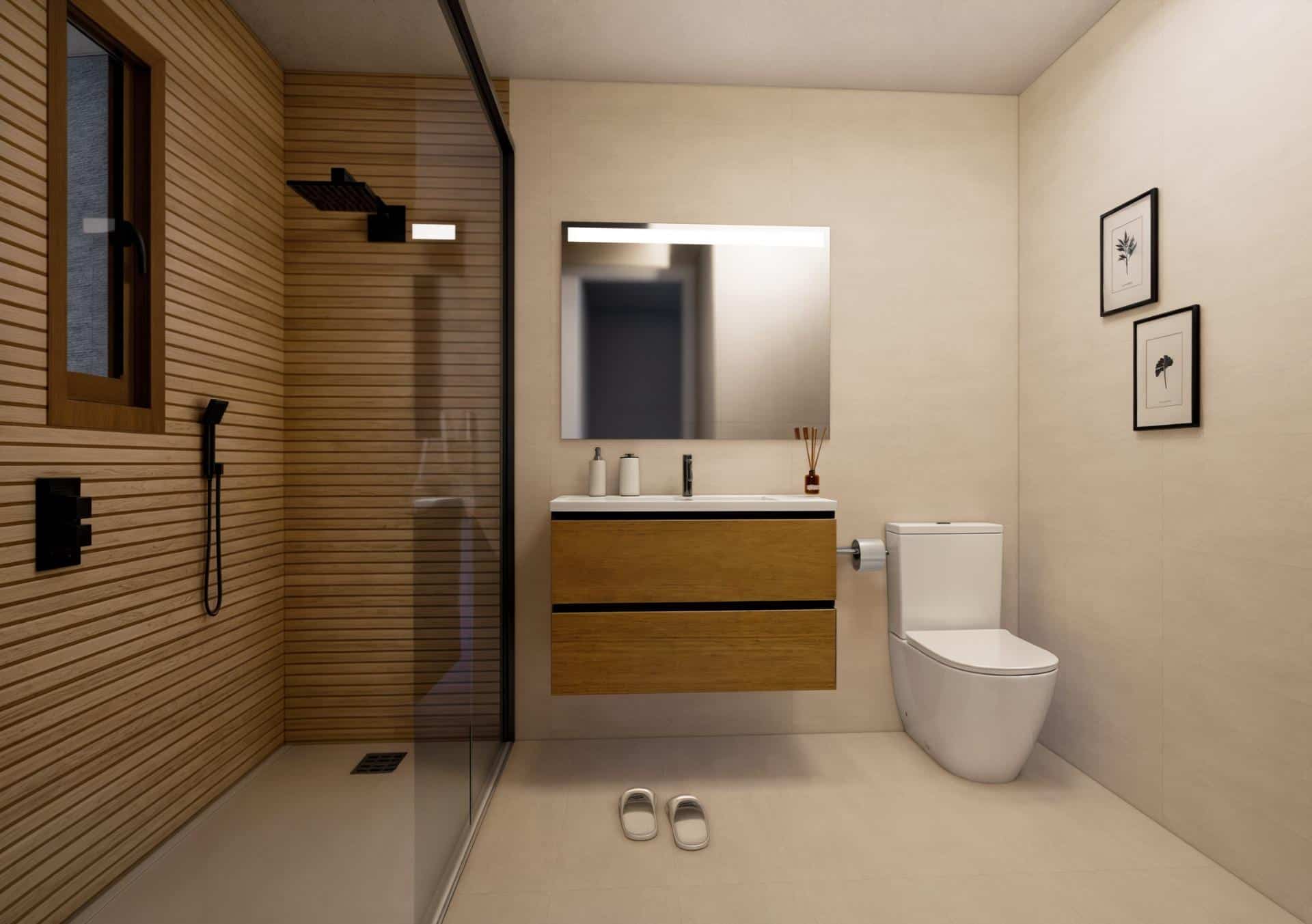 These contemporary one level villas are offered with 2 or 3 bedrooms and 2 bathrooms. All are open plan with living, dining and kitchen areas. The kitchen comes fully fitted with Balay brand ceramic hob, oven, column microwave, refrigerator, extractor hood, and integrated dishwasher.