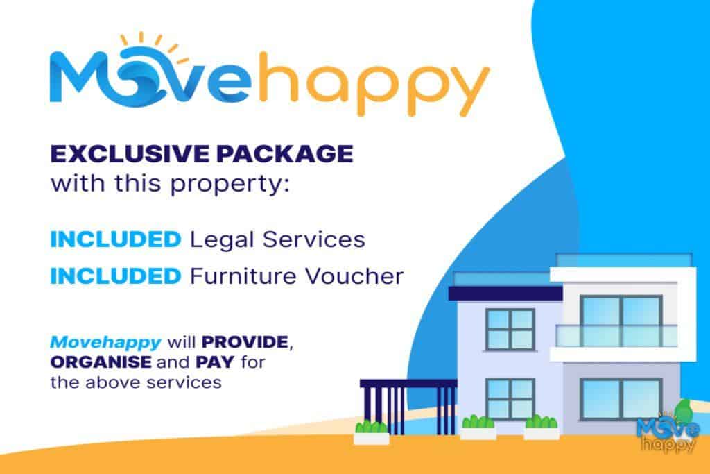 All of our new build properties are offered with our unique Movehappy package. This gives you a total saving of up to €18,000. The package consists of Spanish legal services and a furniture voucher.