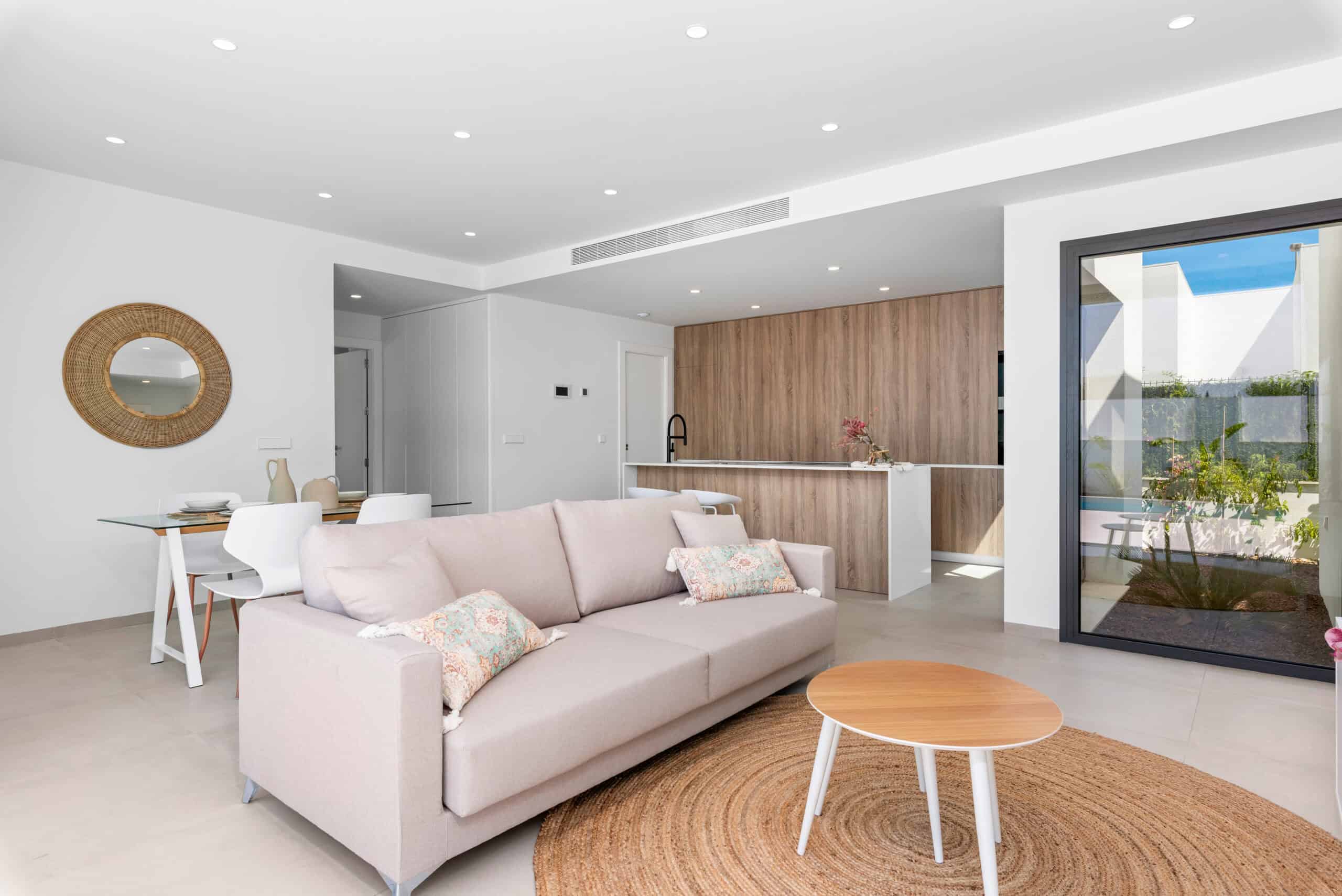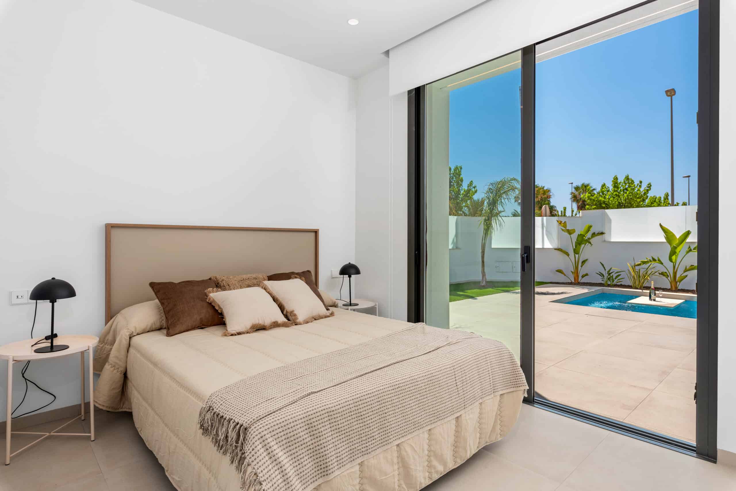 This stunning contemporary villa on a large 502m2 plot in Los Alcazares offers 3 bedrooms and 3 bathrooms, open plan living, dining and kitchen areas.